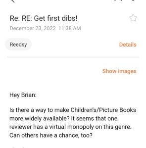 It seems simple enough. Straight-forward. But another Reedsy reviewer didn’t get the memo. Doesn’t care. This guy completely ignores “first dibs.” He swoops in. Snaps up the title before anyone else can respond. Never mind that someone else has “FIRST dibs.” As in, hands off, dude. But Poopy Poaching Dude is looking to score. And does so by stealing from other reviewers. Lame. Unprofessional.  A pretty shabby way to treat fellow reviewers. (Kimber: Can I bite him? Mom: Yes!!)